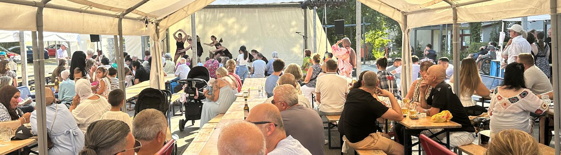 Die Bänke vor der Bühne füllten sich schnell mit den Gästen, die sich bei Kaffee und Kuchen vom Runden Tisch sowie kulinarischen Köstlichkeiten aus aller Herren Länder verwöhnen ließen. Ein großes Dankeschön an die SG DJK Hattersheim, die griechische Gemeinde, die afghanische Gruppe, die alevitische Gemeinde, die ukrainische Gruppe, die Damen von den Sportangeboten und die marokkanische Gemeinde, die mit ihren Ständen zum Gelingen des Festes beigetragen haben.